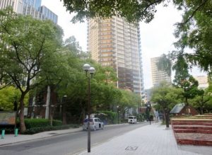 先ほどの横断歩道の交差点を右に曲がったら、そのまま直進(西側)してください。目印として、左前にタワーマンションと関西電力ビルがあります。